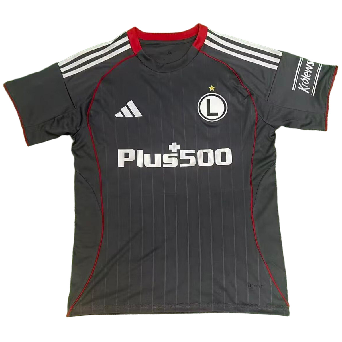 The Adidas Legia Warsaw 2025-2026 third shirt is mainly gray with silver logos, plus maroon detailing on the collar and the piping. Subtle shiny pinstripes create an elegant look.