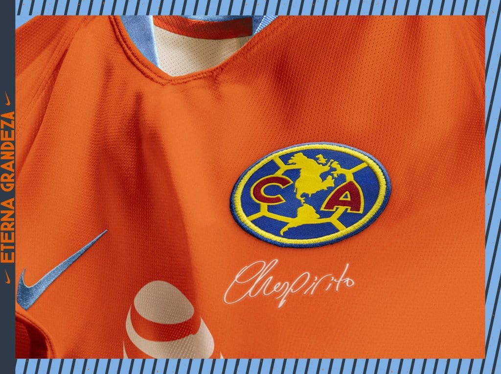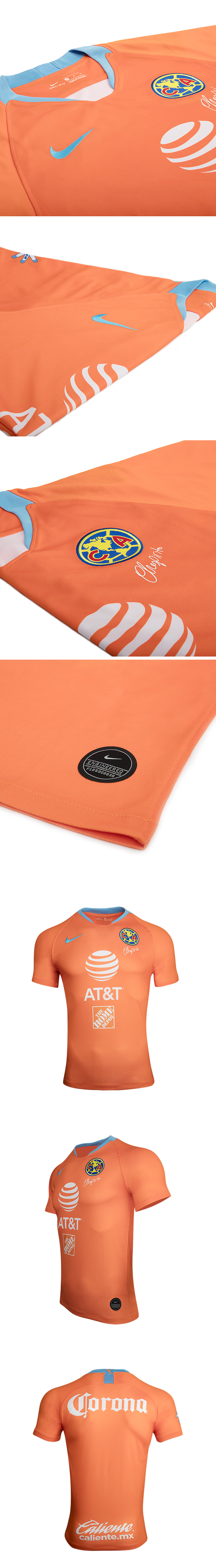 The Club America 2019 third jersey is predominantly orange with light blue accents,