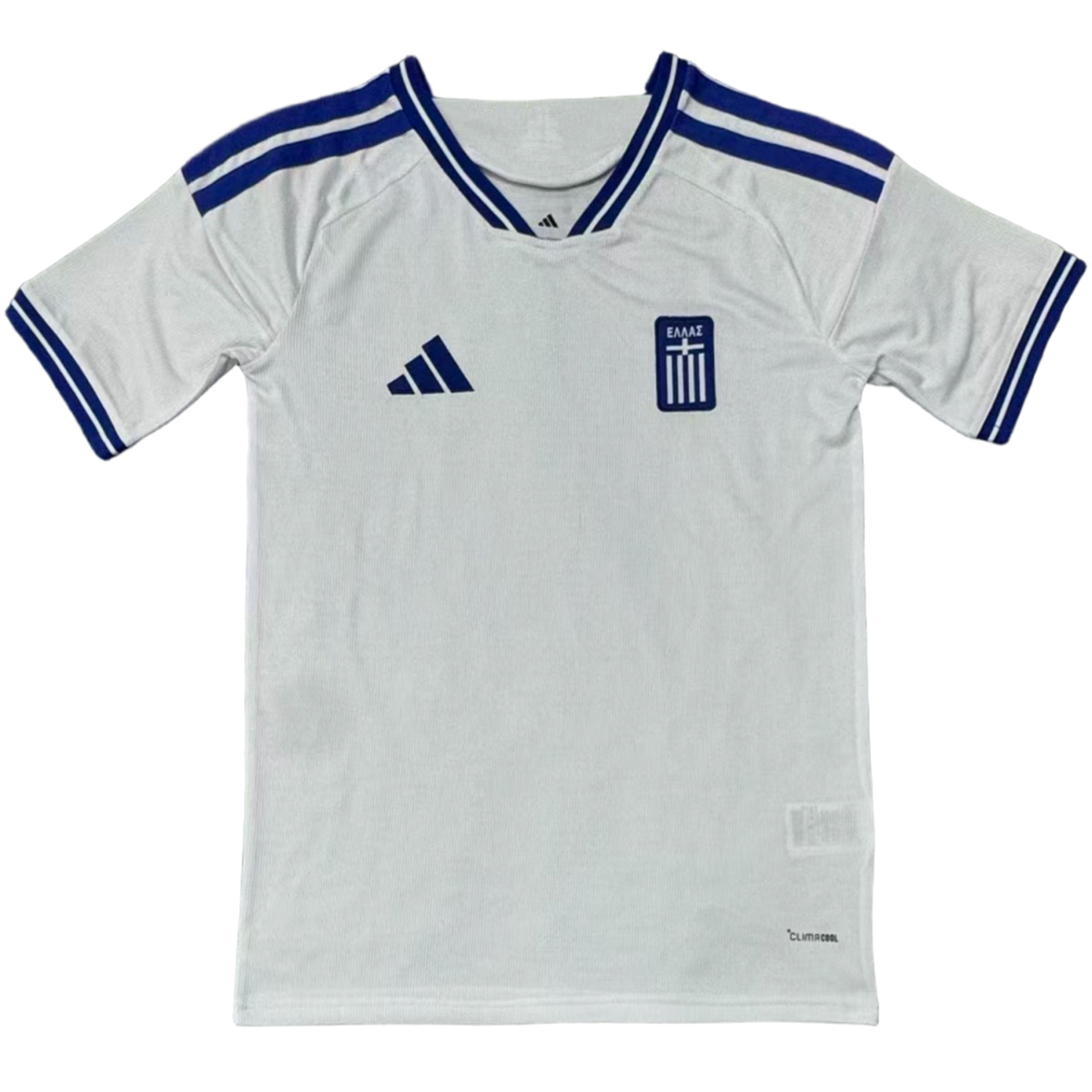 The Adidas Greece 2026 home jersey is predominantly white with royal blue used for the Adidas logo, Three Stripes on the shoulders, and sleeve detailing.